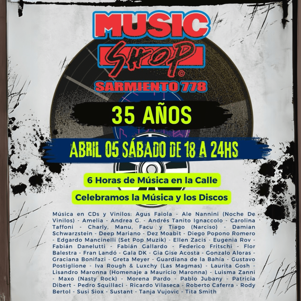 MUSIC SHOP celebra sus 35 años con una gran fiesta al aire libre y para todo el público. En agradecimiento al apoyo recibido durante tantos años, la disquería optó por devolverle a la comunidad un poco de su cariño con un gran evento. La idea se materializará en un encuentro para celebrar la música y los discos, en la calle y con la gente.